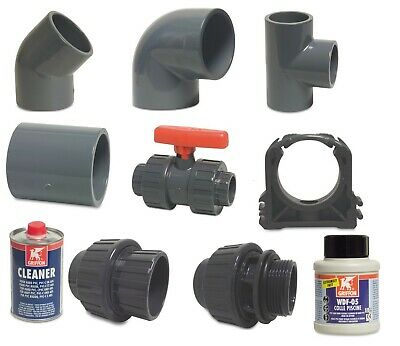 Connectors and manual shut-offs (e.g., Elbows, Tees, Ball Valves) to assemble pipes and control flow direction.